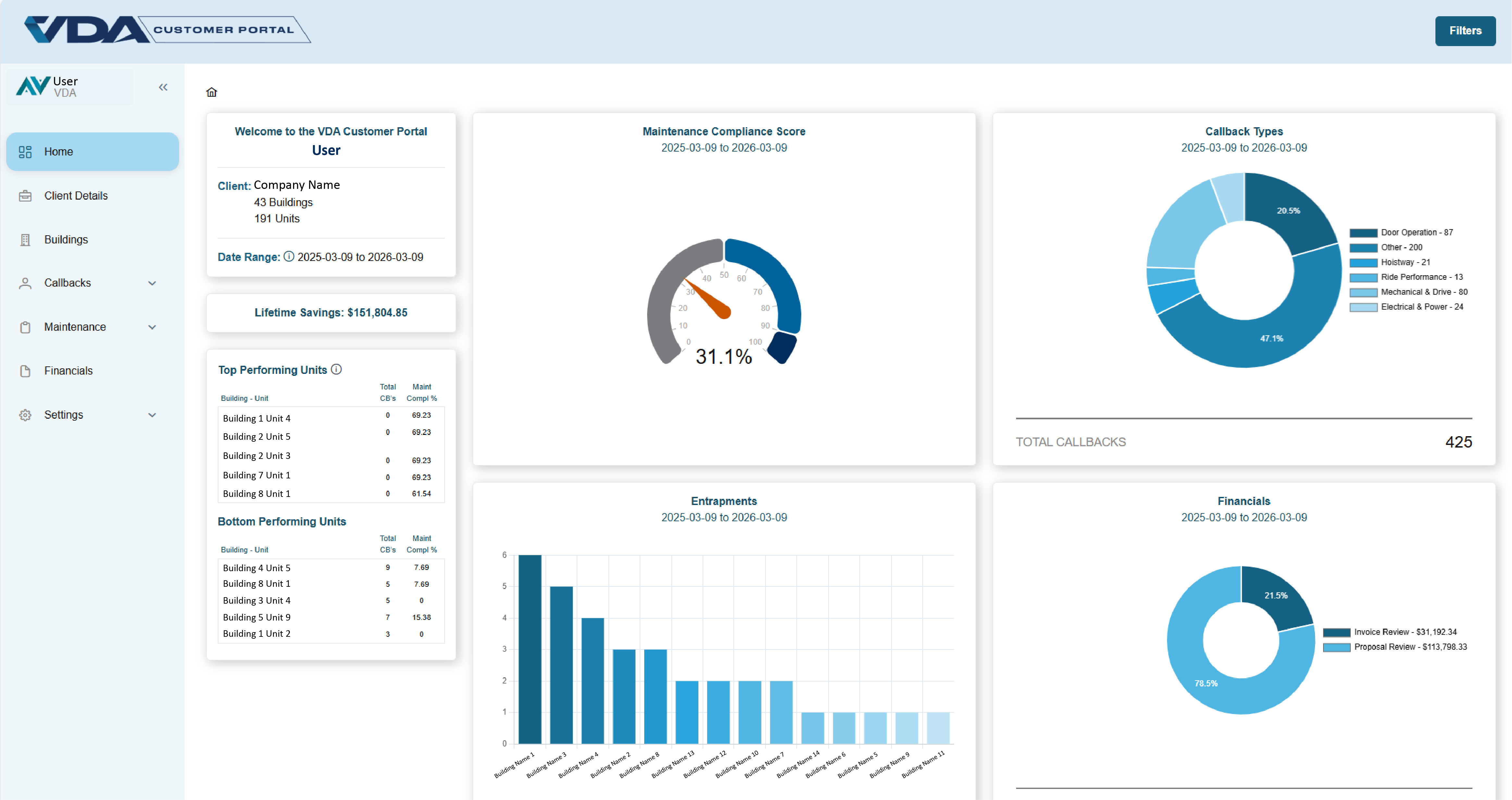 The Customer Portal provides users 24/7 access to their maintenance data, allowing them to track trends and performance. In addition, the portal documents accumulated savings driven by invoice and repair proposal reviews, along with publishing action items and tracking minutes from consistent vendor meetings.